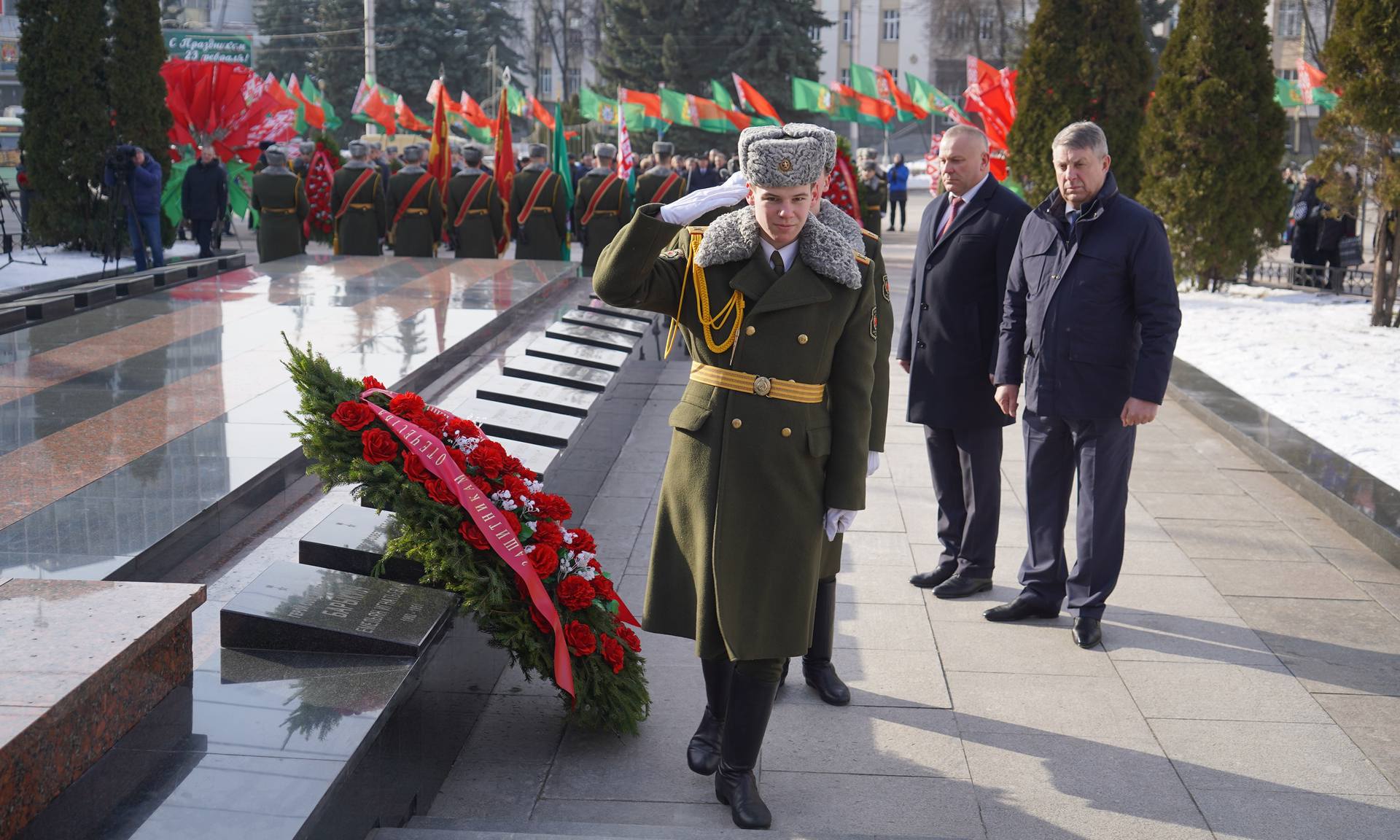 В этот знаменательный день жители Гомельской области вместе с представителями делегаций, прибывших для участия в торжествах, возложили венки и цветы к Вечному огню на площади Труда. Память героев, освобождавших Советский Союз от немецко-фашистских захватчиков, почтили Губернатор Брянской области Александр Богомаз и председатель Брянской областной Думы Валентин Суббот.