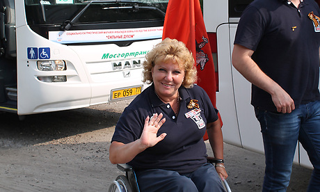 Марафонцы, среди которых девять инвалидов-колясочников, передвигаются на автобусах со специальными подъемниками.