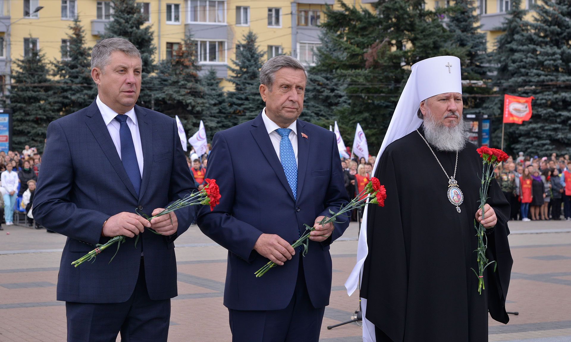 Цветы к Памятнику воинам и партизанам — освободителям Брянска возложили главный федеральный инспектор по Брянской области Леонид Соломатин, члены Совета Федерации ФС РФ Александр Волков и Екатерина Лахова, прокурор Брянской области Александр Войтович, начальник УМВД России по Брянской области Валентин Кузьмин, председатель Брянского областного суда Евгений Быков, военный комиссар Брянской области Андрей Соломенцев, епископ Клинцовский и Трубчевский Владимир, глава города Брянска Александр Хлиманков, глава Брянской городской администрации Александр Макаров, начальник УФСИН по Брянской области Сергей Мороз, начальник ГУ МЧС России по Брянской области Вадим Уваркин, руководитель УФНС России по Брянской области Андрей Маркелов, председатель комитета Брянской областной Думы Юрий Гапеенко, председатель правления РОО «Брянское землячество в г. Москве» Татьяна Наумова.