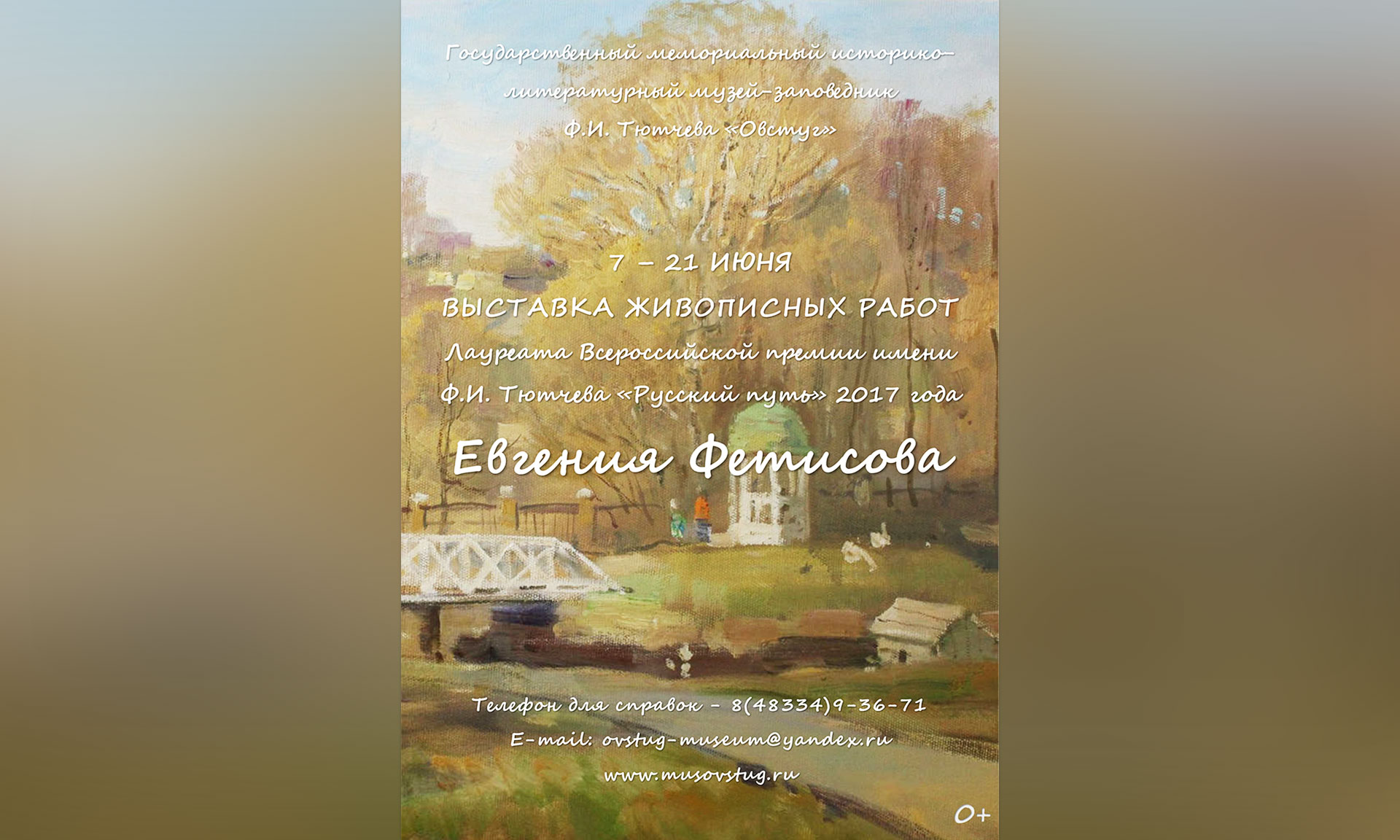 В выставочном зале музея-заповедника Ф. И. Тютчева «Овстуг» открыла свою работу выставка живописных работ брянского художника, лауреата Всероссийской премии имени Ф. И. Тютчева «Русский путь» 2017 года Евгения Фетисова.