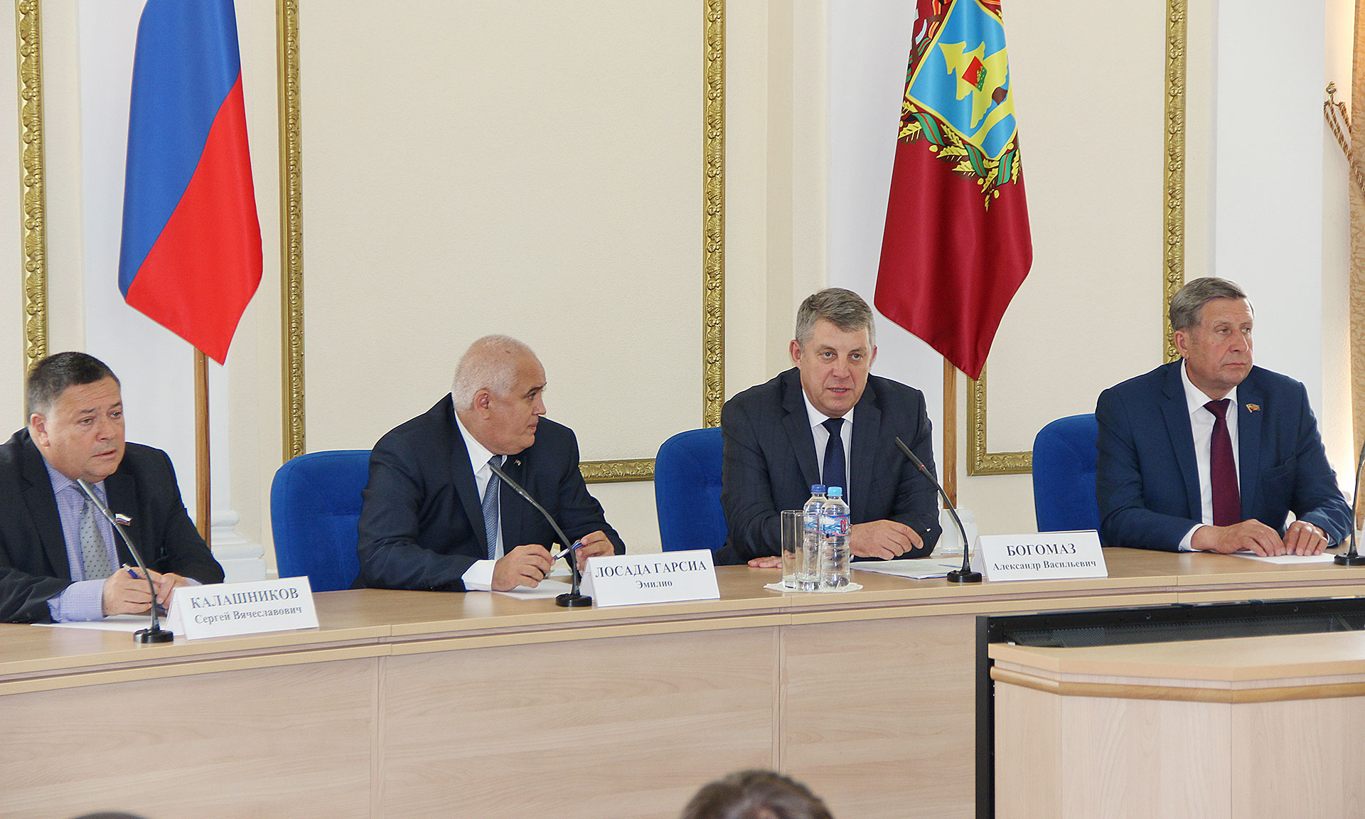 В Правительстве Брянской области состоялась рабочая встреча Губернатора Брянской области Александра Богомаза с членами делегации. Во встрече также приняли участие председатель Брянской областной Думы Владимир Попков, член Совета Федерации Сергей Калашников, директор департамента сельского хозяйства Борис Грибанов.