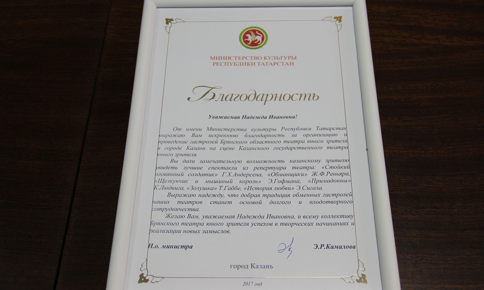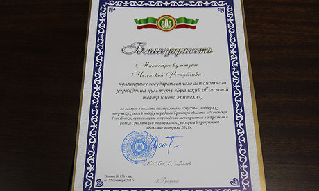 — Особые слова признательности Губернатору Брянской области Александру Васильевичу Богомазу, областному Правительству, проекту партии «Единая Россия» «Театры детям», Министерству культуры за поддержку программы «Большие гастроли для маленьких». Благодаря столь важному проекту наш театр побывал с гастролями в Грозном и Казани. С радостью отмечу, что нашим актерам аплодировали стоя, спектакли прошли с огромным успехом!