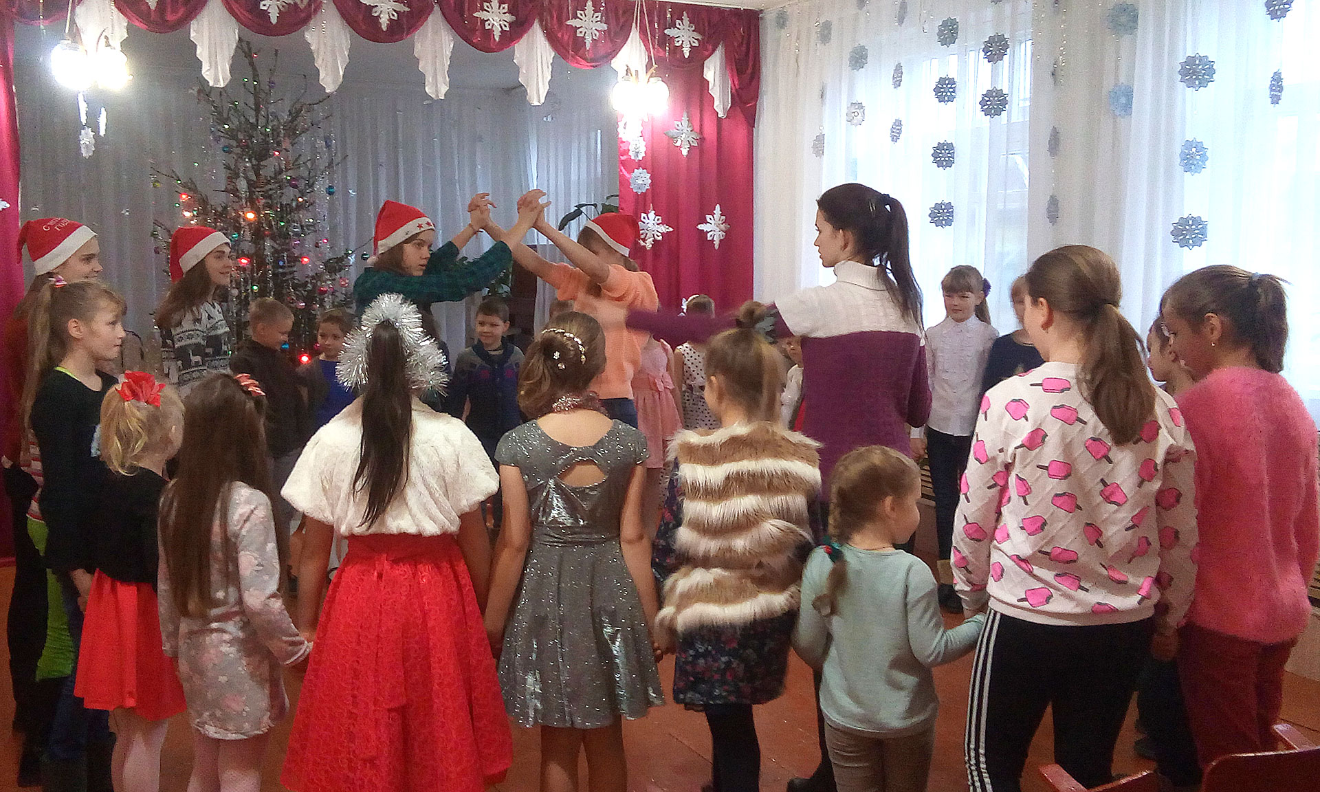 Детей и родителей, пришедших на праздник, встретил нарядно украшенный зал. Открыли мероприятие обучающиеся клуба «Старшеклассник» и педагог дополнительного образования Юлия Лукашова. С удовольствием гости праздника сыграли в весёлые игры «Перекличка», «Хлопки», «Что висит на ёлке», «Природные явления», «Ледяные ворота». А также водили весёлый хоровод.