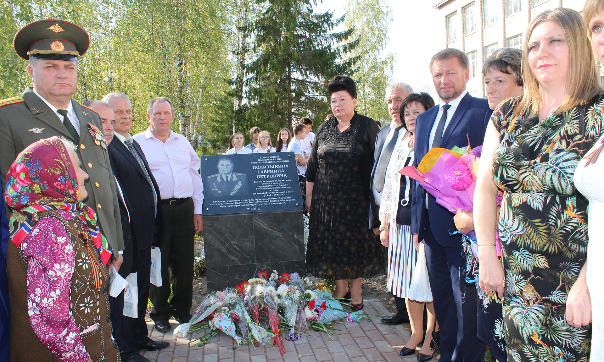 Мероприятие продолжалось, все ближе волнующий момент открытия мемориальной доски. И вот он наступил. Почетное право открыть мемориальную доску в честь героя предоставили внукам генерал-майора авиации Г. П. Политыкина Галине Петушковой и Виталию Пушнякову, главе администрации района Александру Лосю. Галина Петушкова: «С чувством большого волнения вместе с братом мы присутствуем на этом мероприятии. Мы благодарны школе, ее педагогам и ученикам за увековечение памяти о нашем дедушке. Память о тех людях, которые ценой неимоверных усилий, а часто и своей жизни завоевали для нас право жить в свободной стране и под мирным небом, должна жить в нынешних и будущих поколениях. Это надо живым, тем, кто родился под мирным небом и не знал войны, чтобы помнить, какой ценой достается счастье, и стремиться сохранить его ради жизни на земле. Пока мы будем помнить своих героев — мы будем жить».