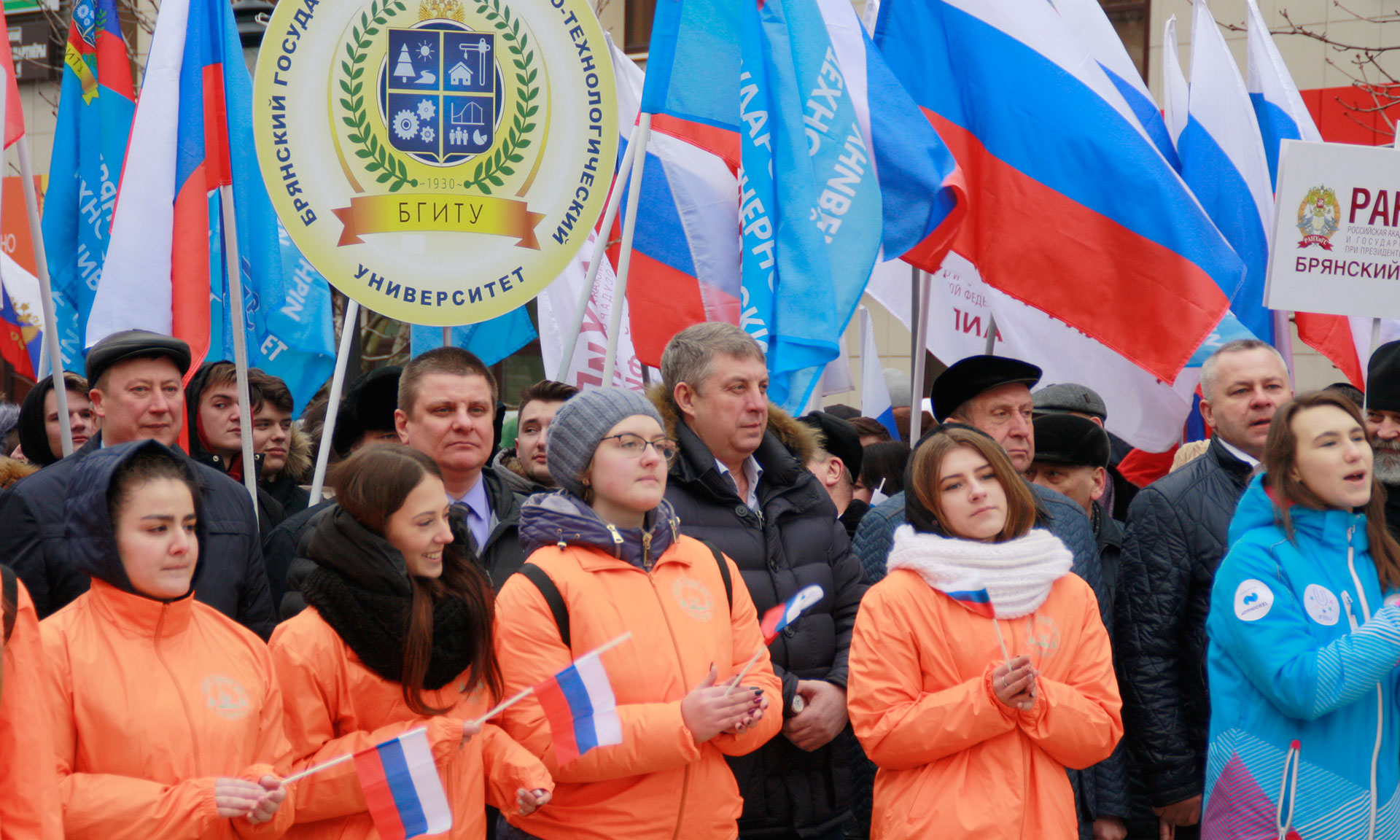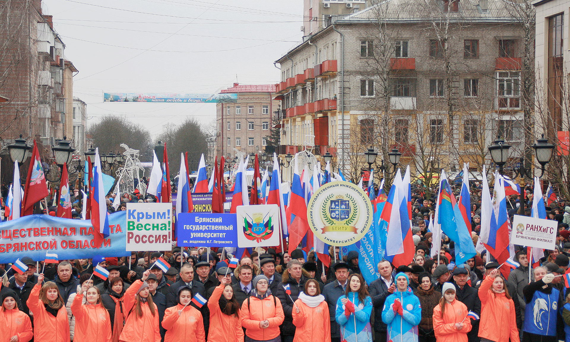 Несмотря на прохладную погоду «Крымская весна» своим теплом объединила несколько тысяч жителей Брянской области: представителей предприятий и организаций, молодежь и студенчество Брянской области, представителей общественных организаций и объединений, руководителей региона, депутатов Государственной Думы Федерального Собрания Российской Федерации, представителей органов исполнительной государственной власти и федеральных территориальных органов государственной власти, депутатов.