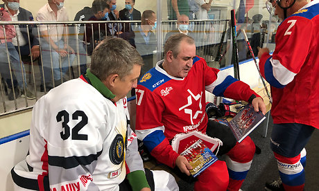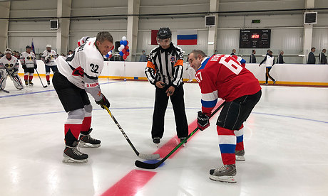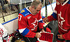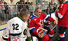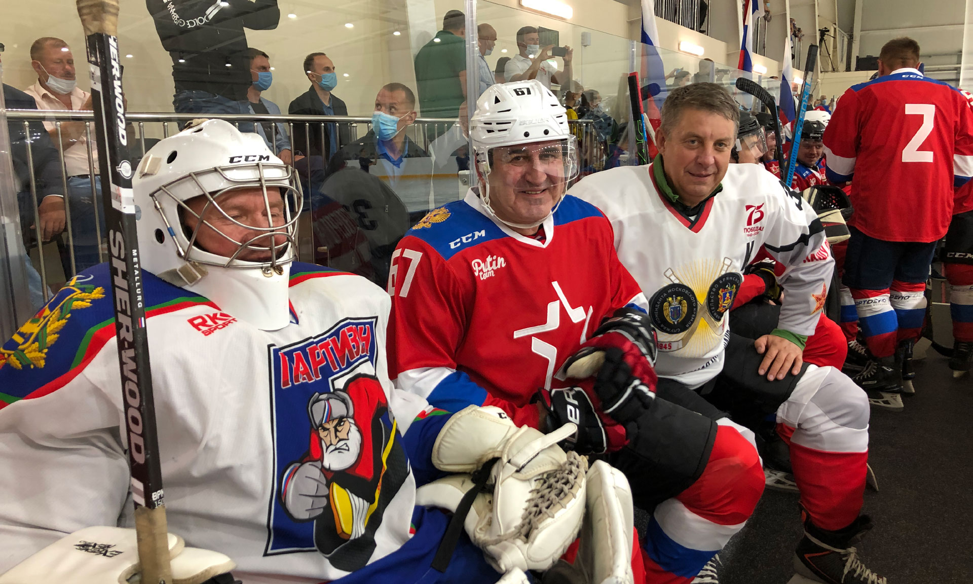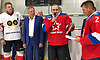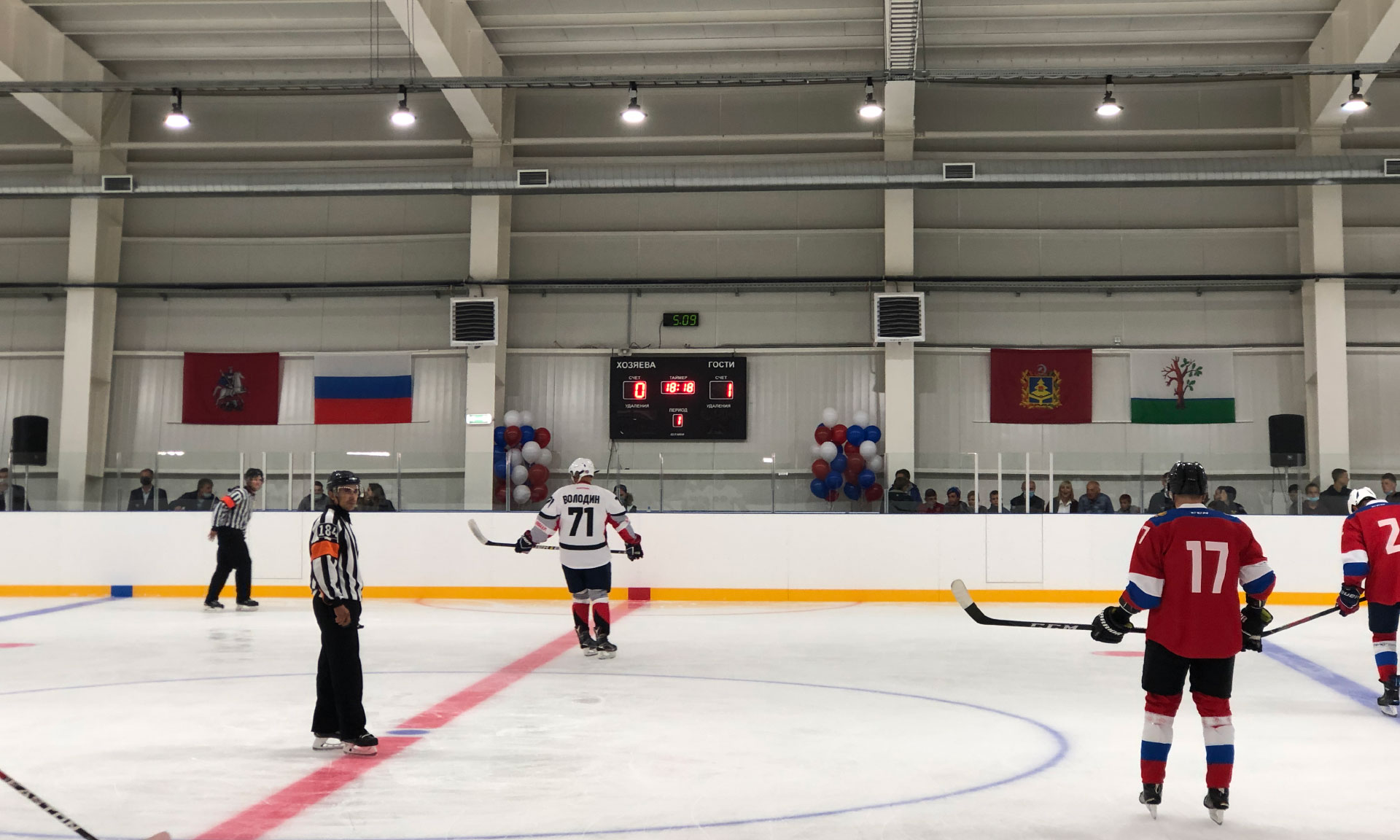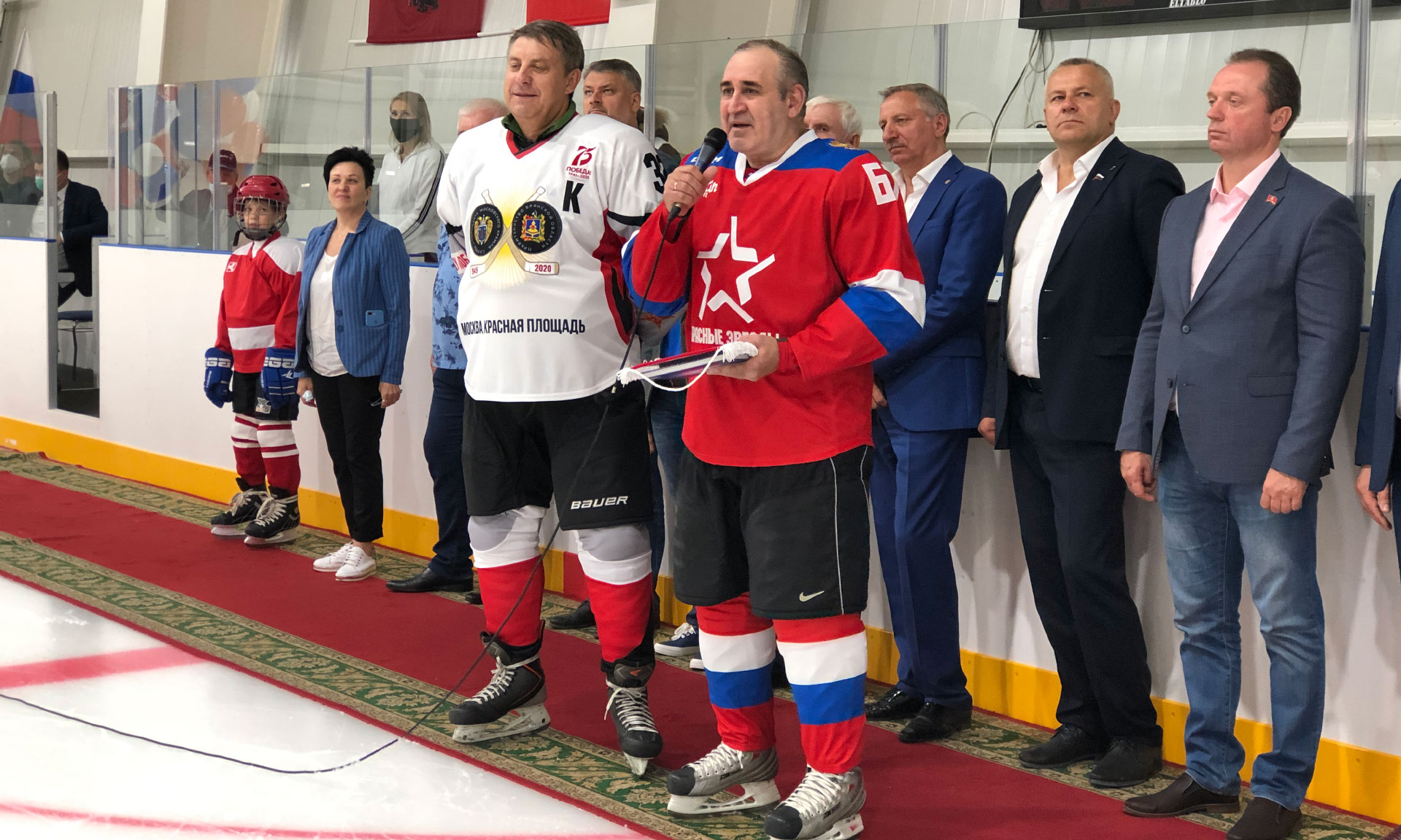 Для символического вбрасывания шайбы на лед были приглашены капитаны команд Сергей Неверов и Александр Богомаз.