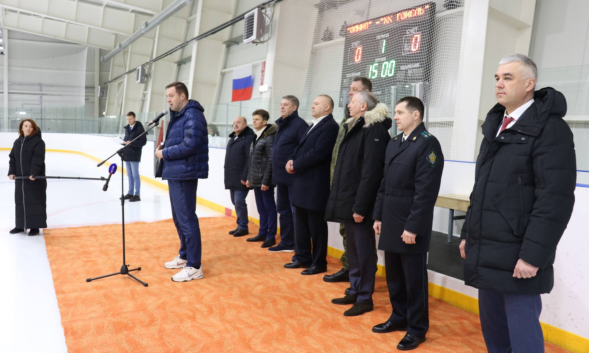 — Добрый день участники соревнований, дорогие наши гости-белорусы, уважаемые земляки. Я от всей души поздравляю вас с нашим общим праздником — Днем защитника Отечества. Сегодня на лёд вышли наши дети, будущее наших стран. И если говорить о празднике — Дне защитника Отечества, то он символизирует тех, кто служил, кто сегодня служит, или кто защищал и сегодня защищает нашу страну Россию и Республику Беларусь. Очень символично сегодняшнее проведение товарищеского матча между командой г. Гомеля, командой олимпийского резерва и чемпионами Брянской области прошлого года, командой г. Стародуба. Сегодня здесь, на площадке, встретятся наши дети, будущие защитники Республики Беларусь и будущие защитники нашей страны. У нас общее прошлое, общая история, общие исторические ратные подвиги наших предков, и у нас сегодня общее настоящее и общее будущее.