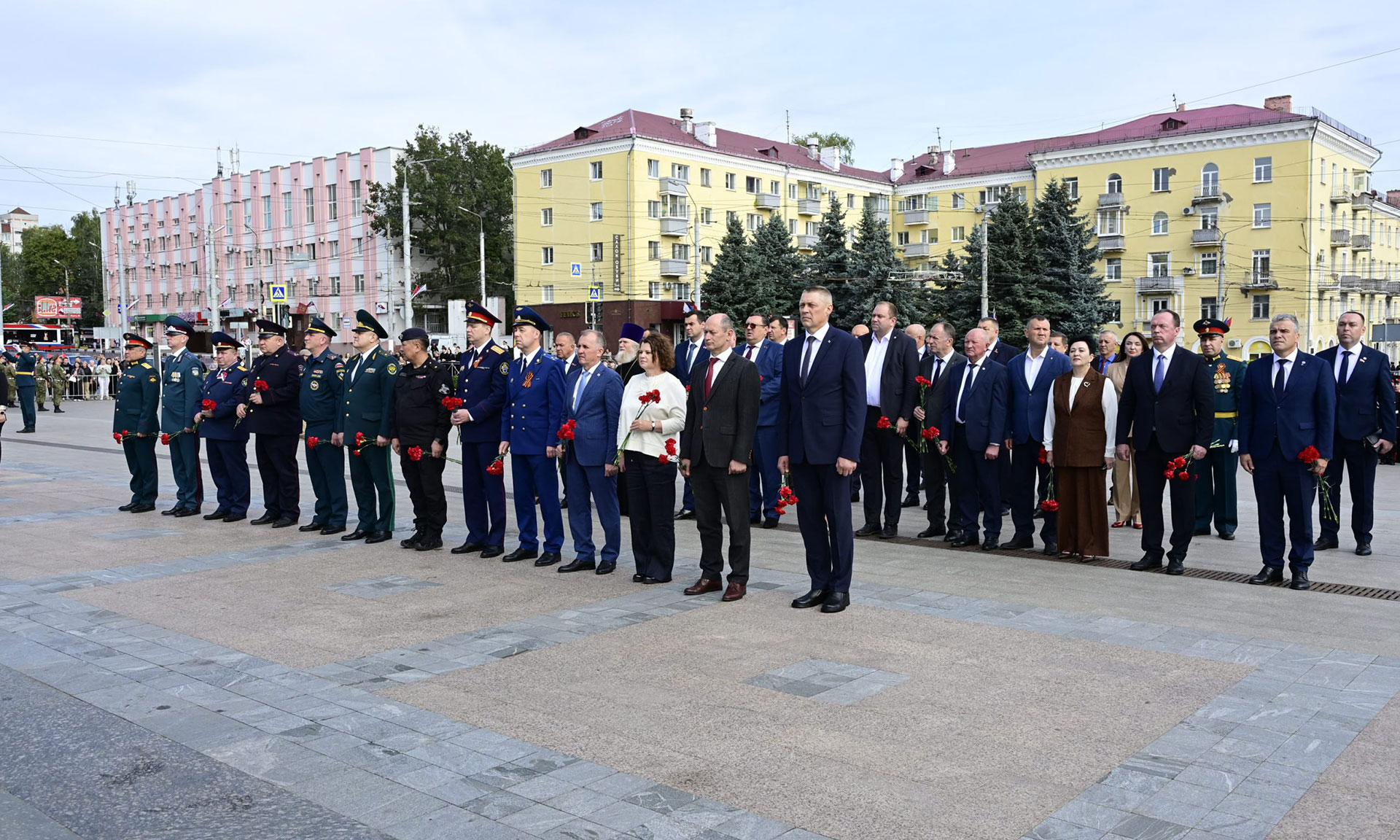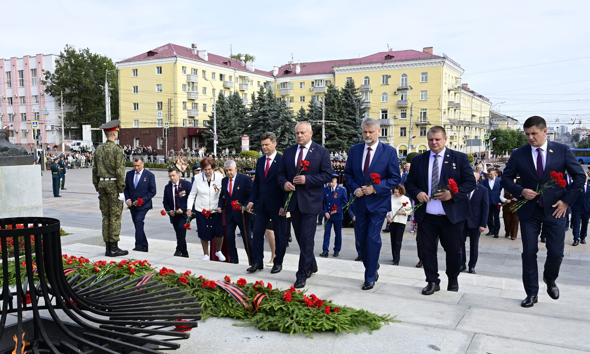 В знак памяти и благодарности воинам и партизанам, победителям в Великой Отечественной войне 1941–1945 годов, гирлянду и цветы к вечному огню памяти народной возложили Губернатор Брянской области Александр Богомаз, заместитель председателя Гомельского областного исполнительного комитета Андрей Барановский, ветеран Великой Отечественной войны, почётный гражданин города Брянска Борис Васильевич Шапошников, председатель Брянской областной Думы Валентин Суббот, главный федеральный инспектор по Брянской области Андрей Дьячук, сенаторы Российской Федерации Василий Попадайло и Вадим Деньгин, Герой Российской Федерации Александр Постоялко, участник СВО, кавалер трех орденов Мужества, участник президентской кадровой программы «Время героев», подполковник Евгений Вылцан, первый Губернатор Брянской области, почетный гражданин Брянской области Юрий Евгеньевич Лодкин, Герой Труда Брянской области Михаил Кабанов, мать Героя Российской Федерации, погибшего в Чечне офицера Олега Ермакова — Лидия Филипповна Ермакова, мать погибшего в Сирии офицера Федора Журавлева — Людмила Федоровна Журавлева, мать погибшего в специальной военной операции офицера Дмитрия Седнева — Марина Николаевна Седнева, руководители прокуратуры, правоохранительных органов и силовых структур, заместители Губернатора, руководители города Брянска, представители Брянской епархии, руководители органов исполнительной власти области, общественных организаций, жители города Брянска.