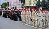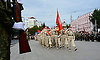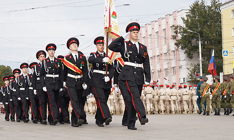 Торжественным маршем прошли кадеты Клинцовской кадетской школы «Юный спасатель» имени героя Советского Союза С. И. Постевого, коробки юнармейцев, сводный военный духовой оркестр Брянской области.