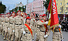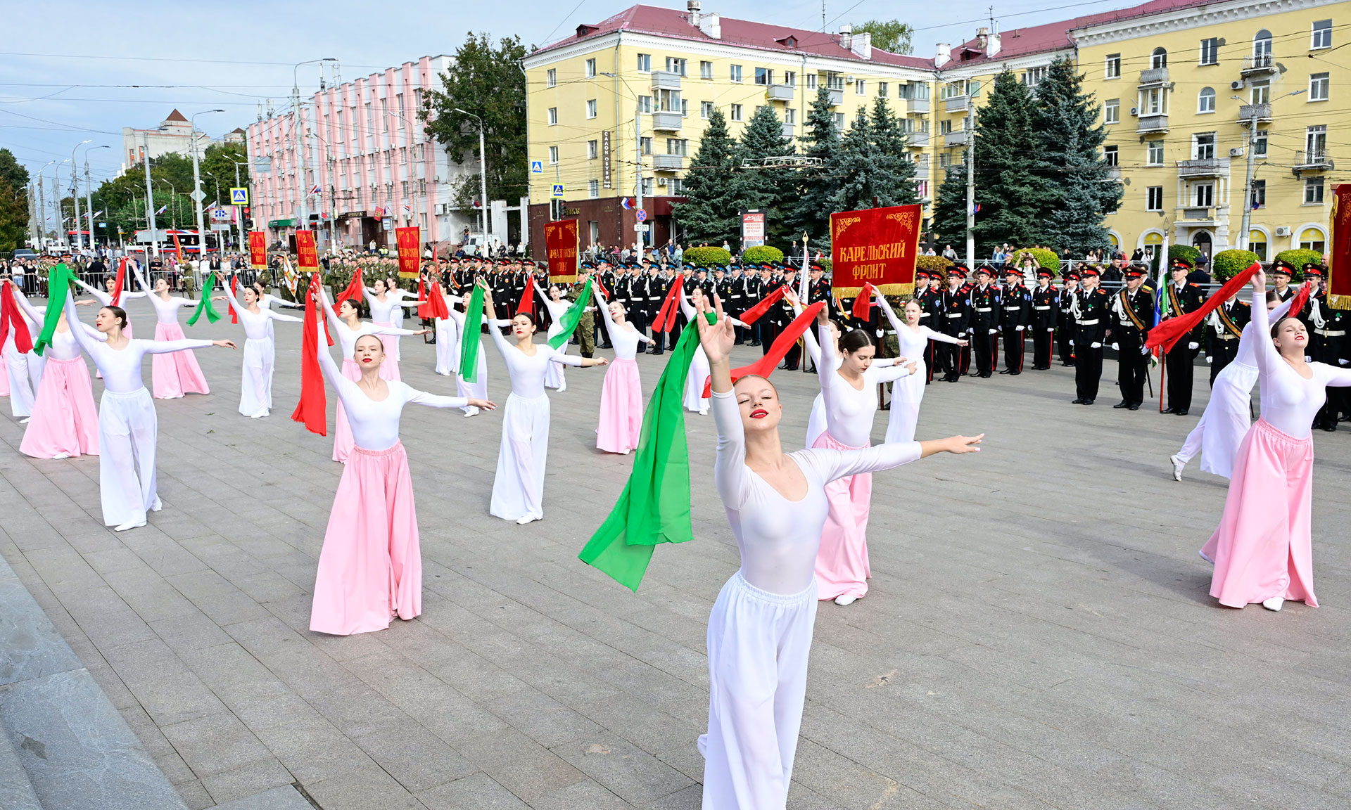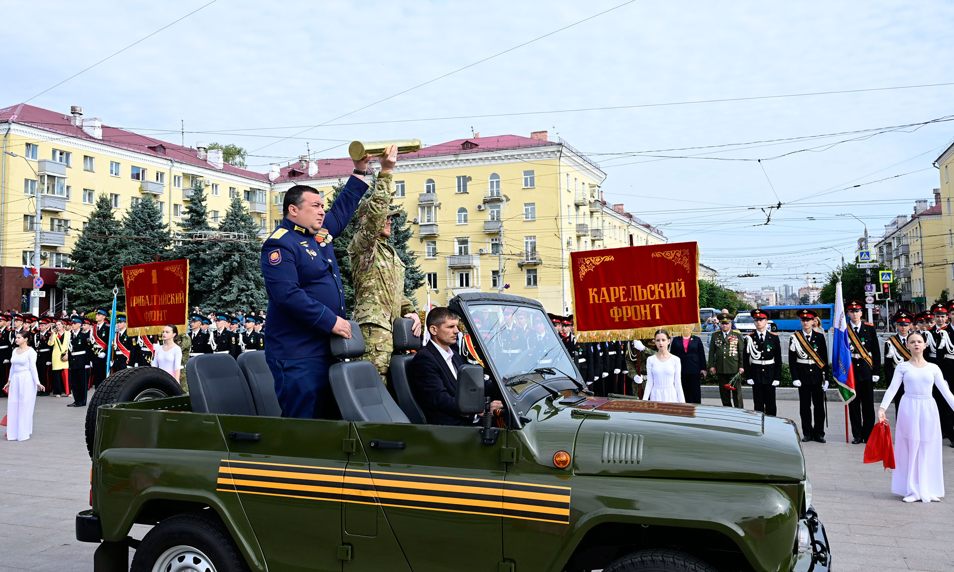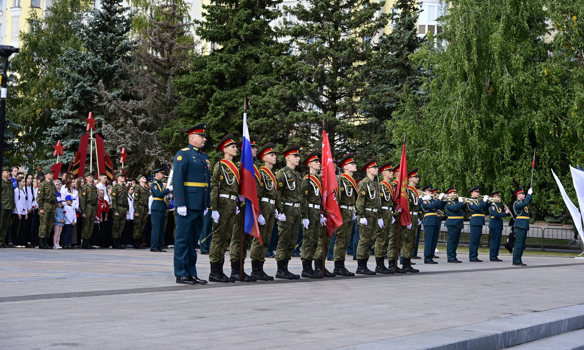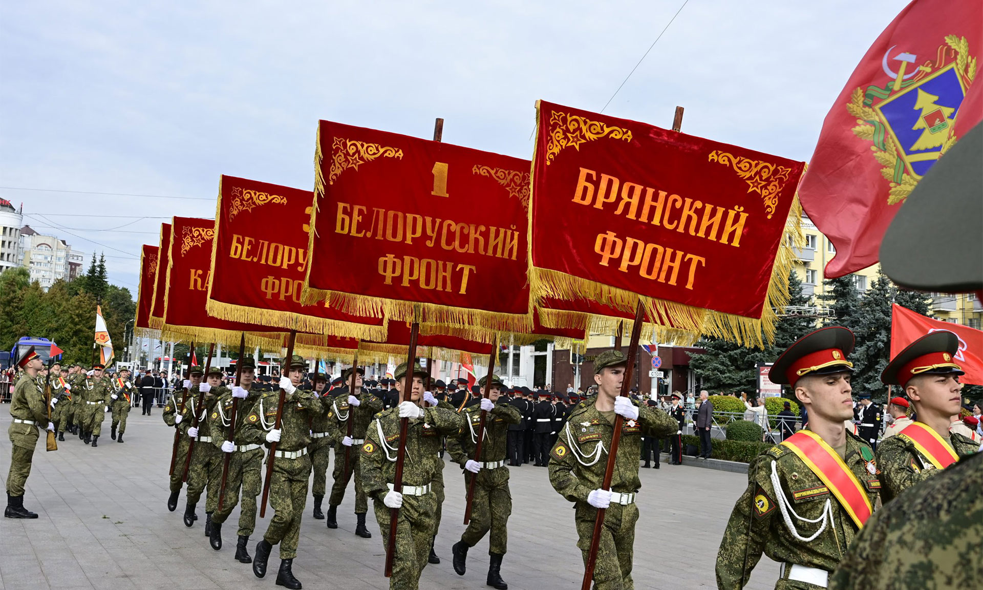На площадь Партизан были внесены Государственный флаг Российской Федерации, копия Знамени Победы и флаг Брянской области. В парадном марше на Площади Партизан — штандарты фронтов и соединений, освободивших нашу Родину. Наименования этих фронтов золотыми буквами вписаны в историю России. Они символизируют доблесть, честь и отвагу защитников нашей Родины. Штандарты несли продолжатели славных воинских традиций — курсанты военного учебного центра Брянского государственного инженерно-технологического университета.