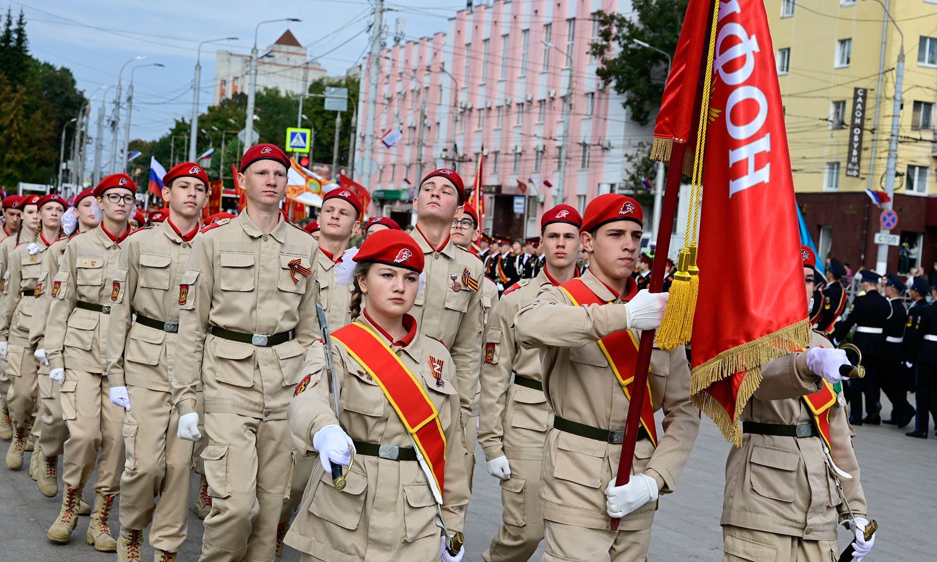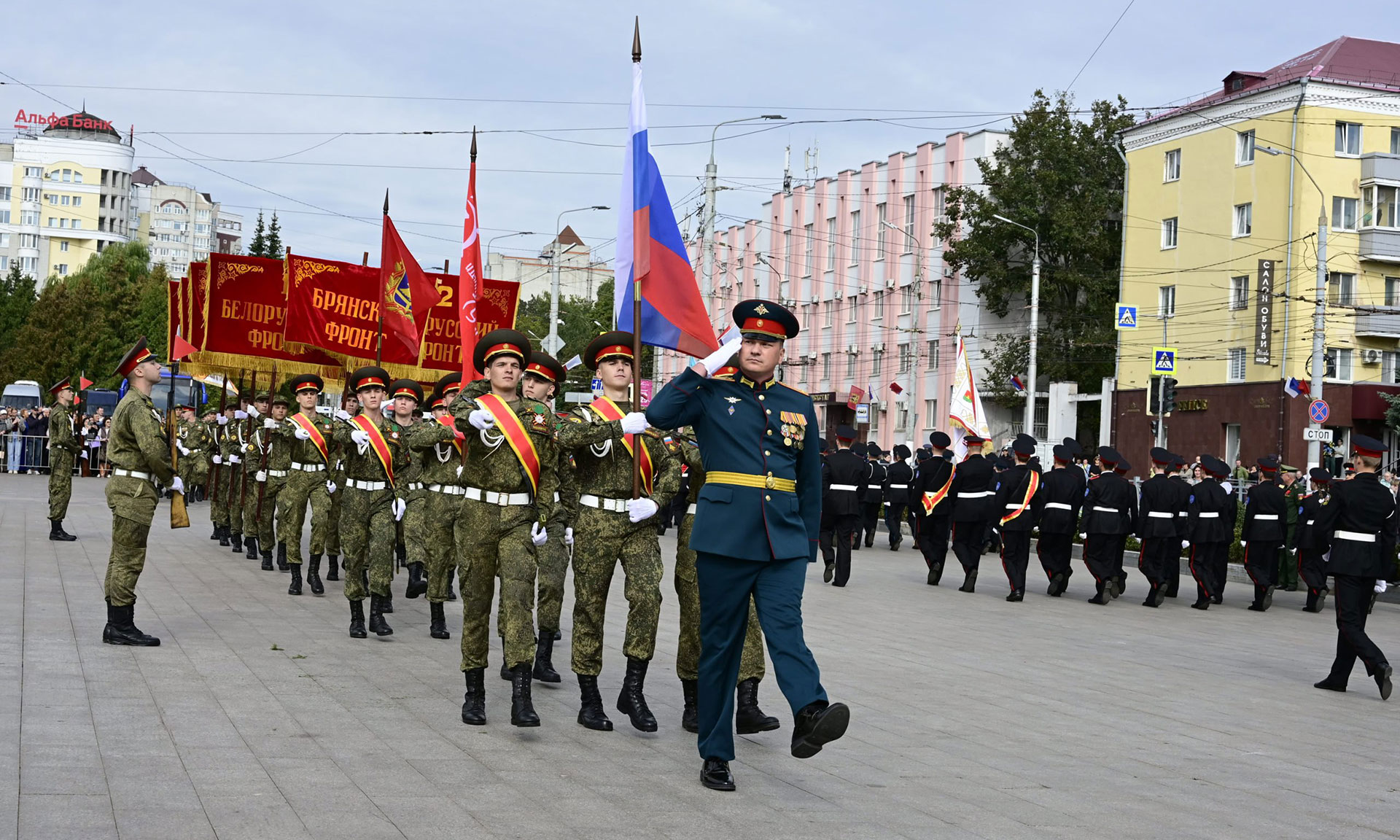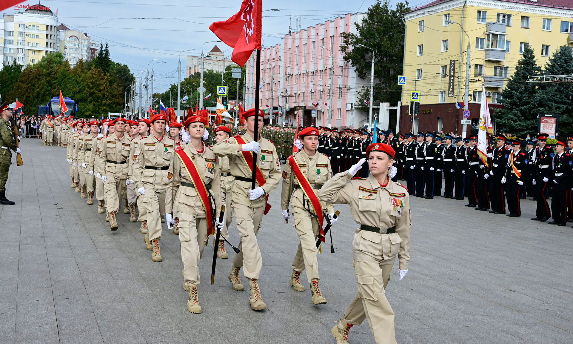 В парадном строю — курсанты военного учебного центра, парадный расчет Брянской кадетской школы имени Героя России В. И. Шкурного, Дятьковской кадетской школы имени Героя Советского Союза И. А. Кашина, казаки-кадеты лучшего казачьего кадетского корпуса Российской Федерации по итогам Всероссийского смотра-конкурса 2025 года. Уже в октябре в Кремле кадеты получат переходящее знамя Президента России!